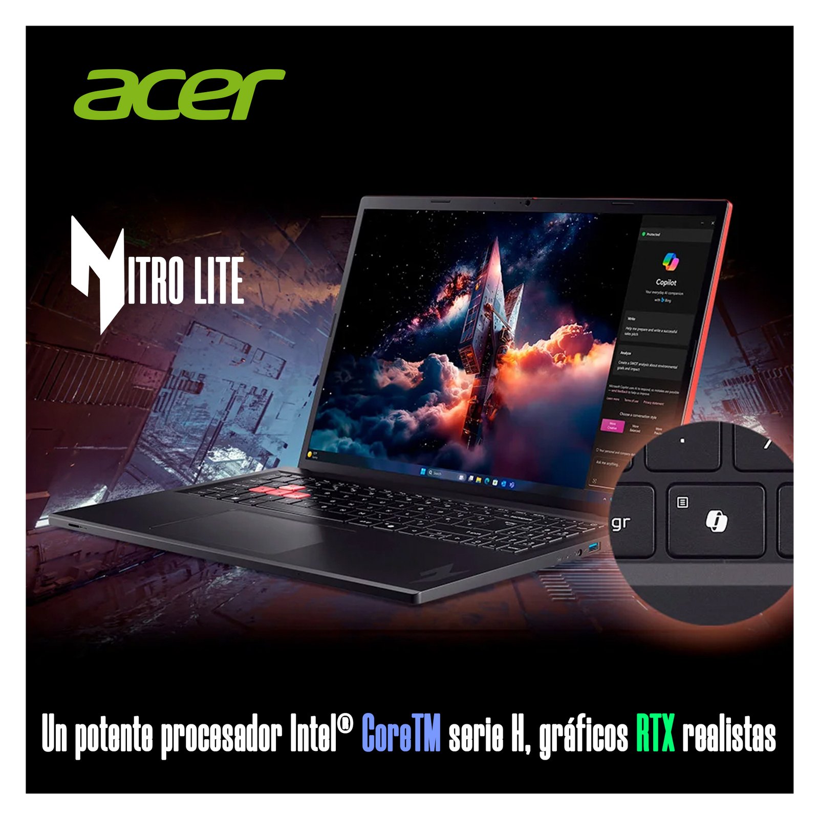 Lleva tu experiencia de juego al siguiente nivel con el Acer Nitro Lite 16 (NL16-71G-5616). Diseñado para ofrecer una fluidez excepcional gracias a su pantalla de 165Hz y el respaldo de la arquitectura de vanguardia de Intel y NVIDIA, este portátil es la herramienta definitiva para quienes buscan rendimiento competitivo, multitarea eficiente y un estilo visual impecable sin compromisos.